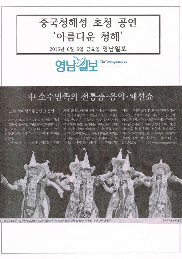 2015.06.05 영남일보) 중국청해성 초청 공연 페이지 정보 작성자 중국문화원 작성일15-06-11 09:36 조회2,630회 댓글0건 이전글 다음글 본문 영남일보 댓글목록 등록된 댓글이 없습니다. 이전글 다음글